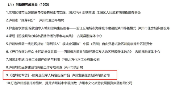 近日,由泸州发展担保公司创新设计的“酒城助军贷”产品,凭借在退役军人创业、就业、困难帮扶服务领域的突出贡献,成功入围