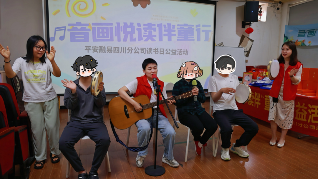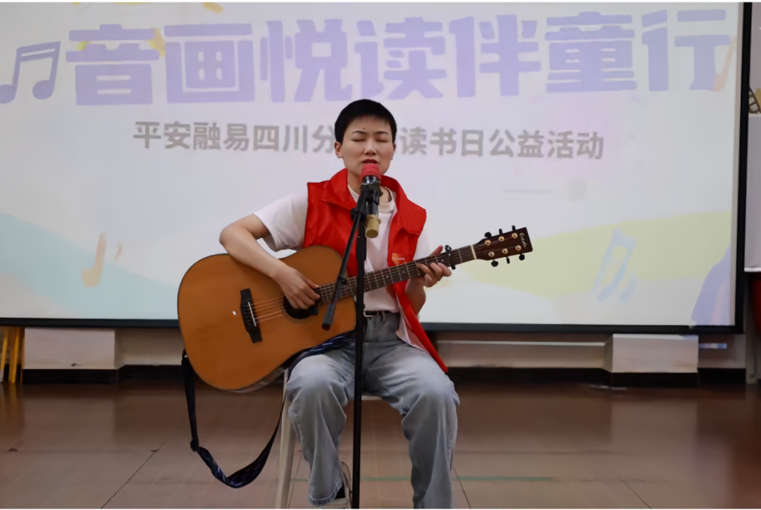 活动开场,平安融易四川分公司志愿者周程程坐在孩子中间,怀抱吉他弹唱起自己的原创歌曲《从前以后》,带领“孩子”们进入音乐世界。