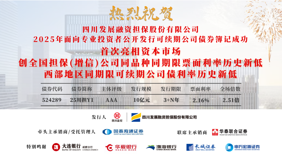 5月28日,四川金控集团旗下四川发展融资担保股份有限公司(以下简称“四川发展担保”或“公司”)2025年面向专业投资者公开发行可续期公司债券在深交所簿记成功。这是四川发展担保作为债券发行人首次亮相资本市场,票面利率创全国担保(增信)公司同品种同期限历史新低、西部地区同期限可续期公司债历史新低!